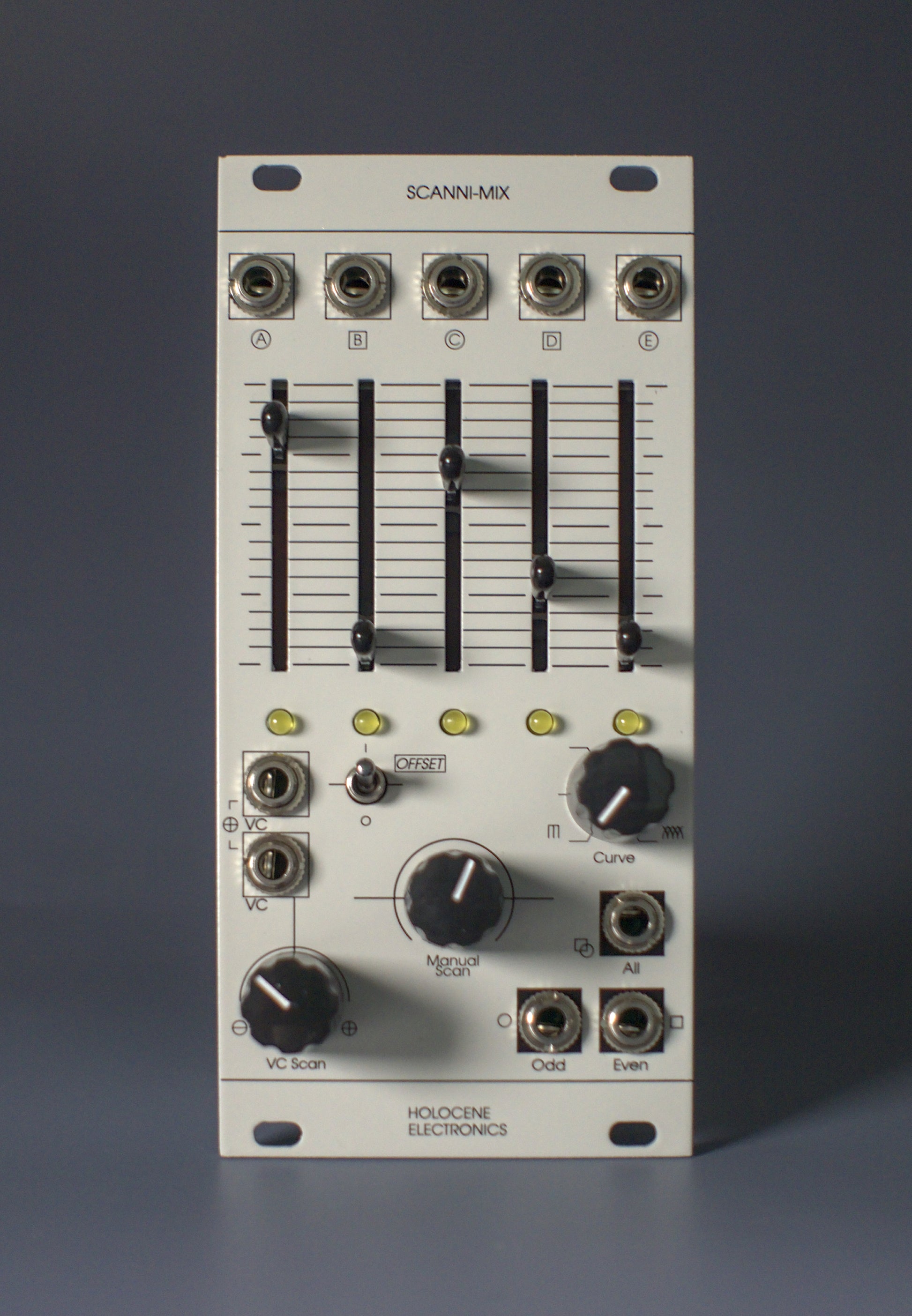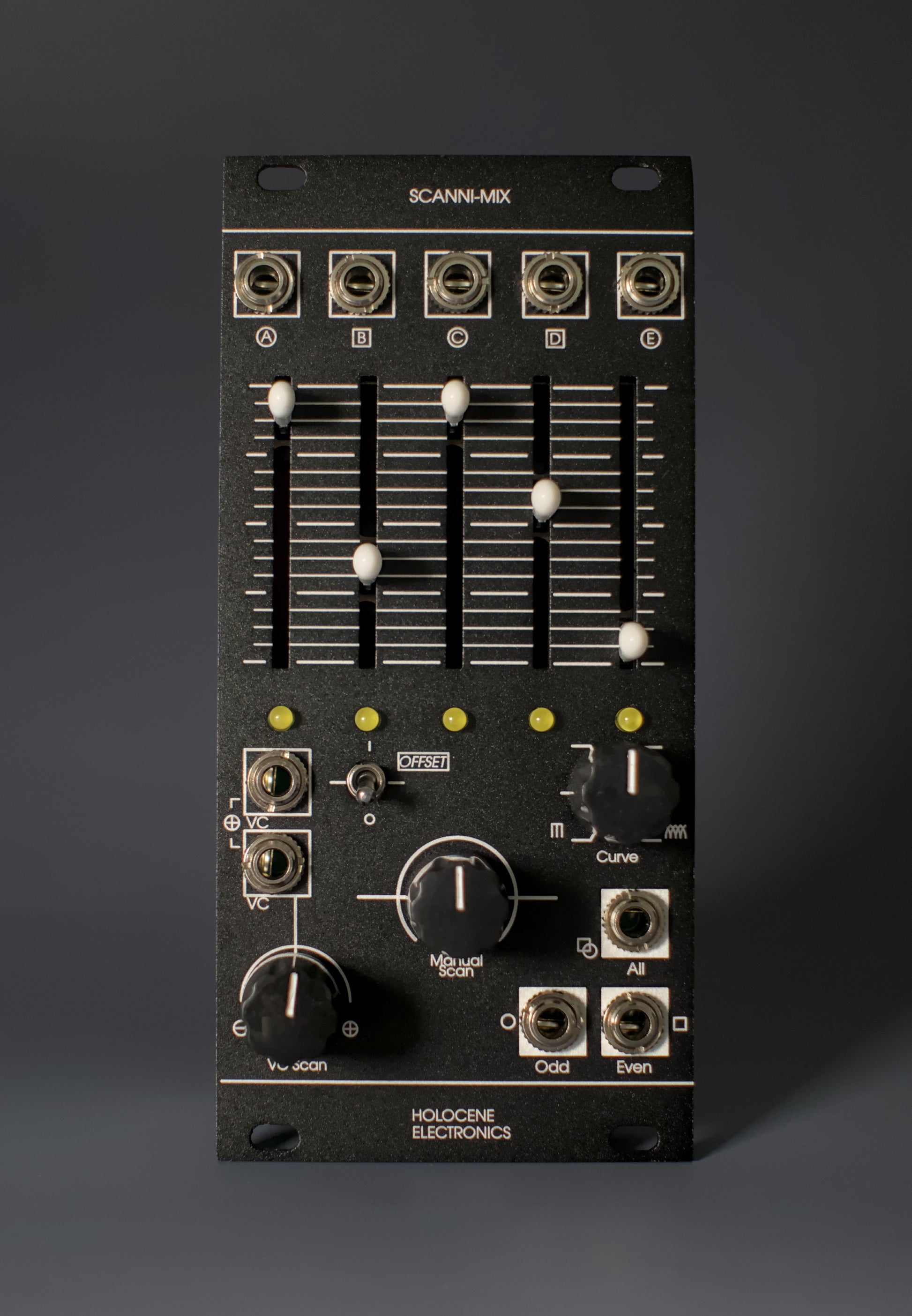 SCANNI-MIX is a 12HP 5 input Voltage-Controlled Scanning Audio/CV Mixer and Panner.